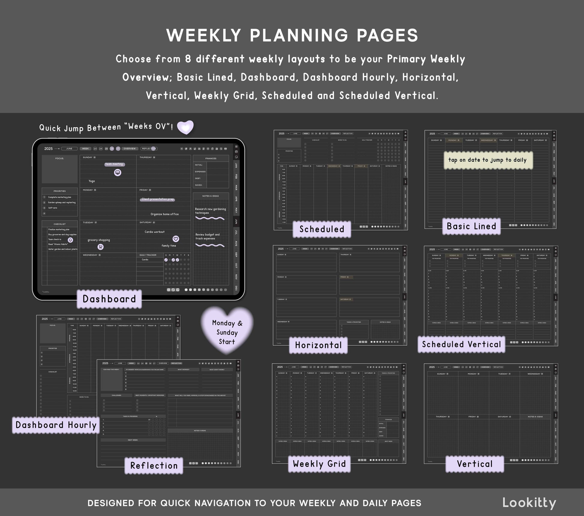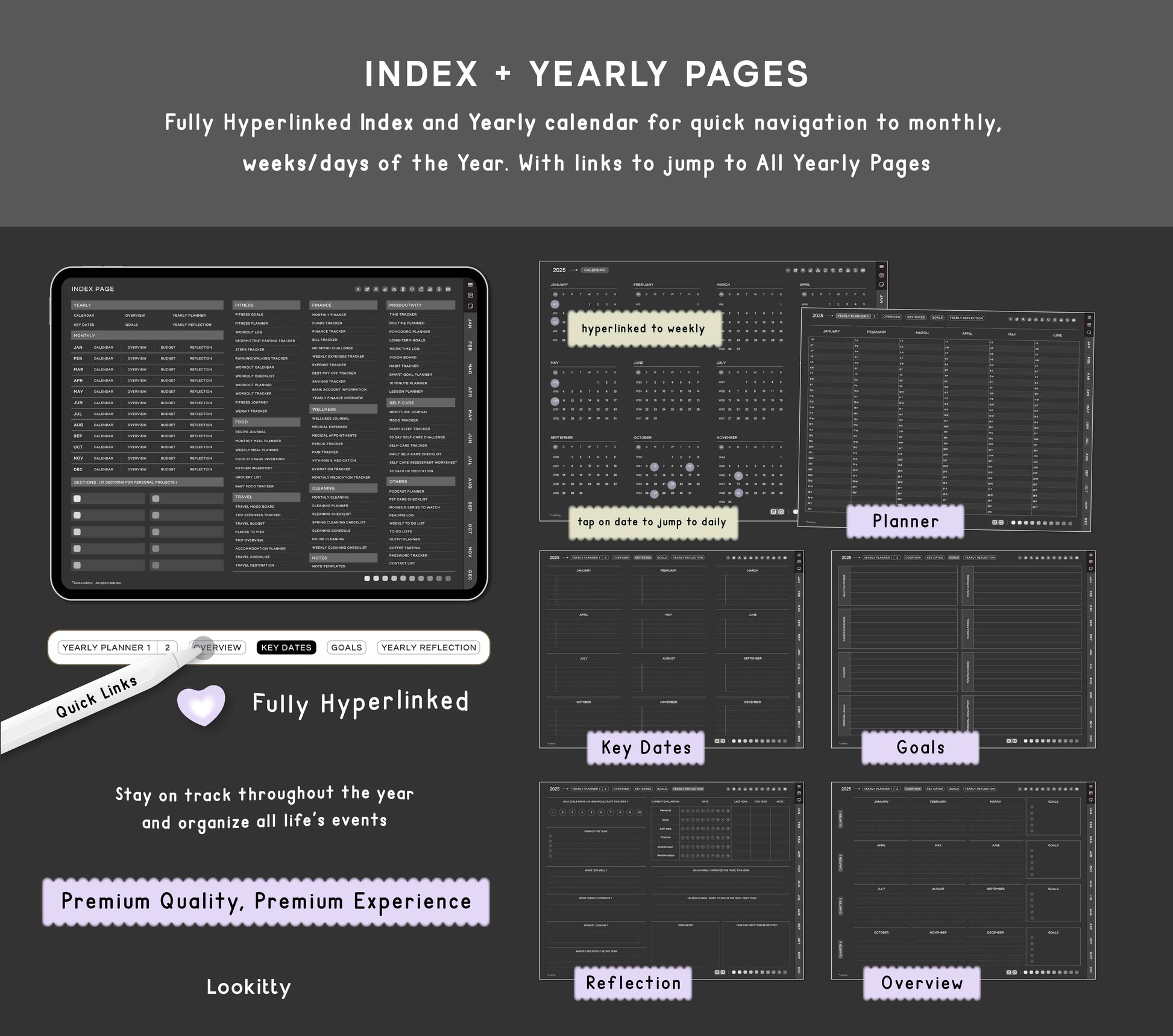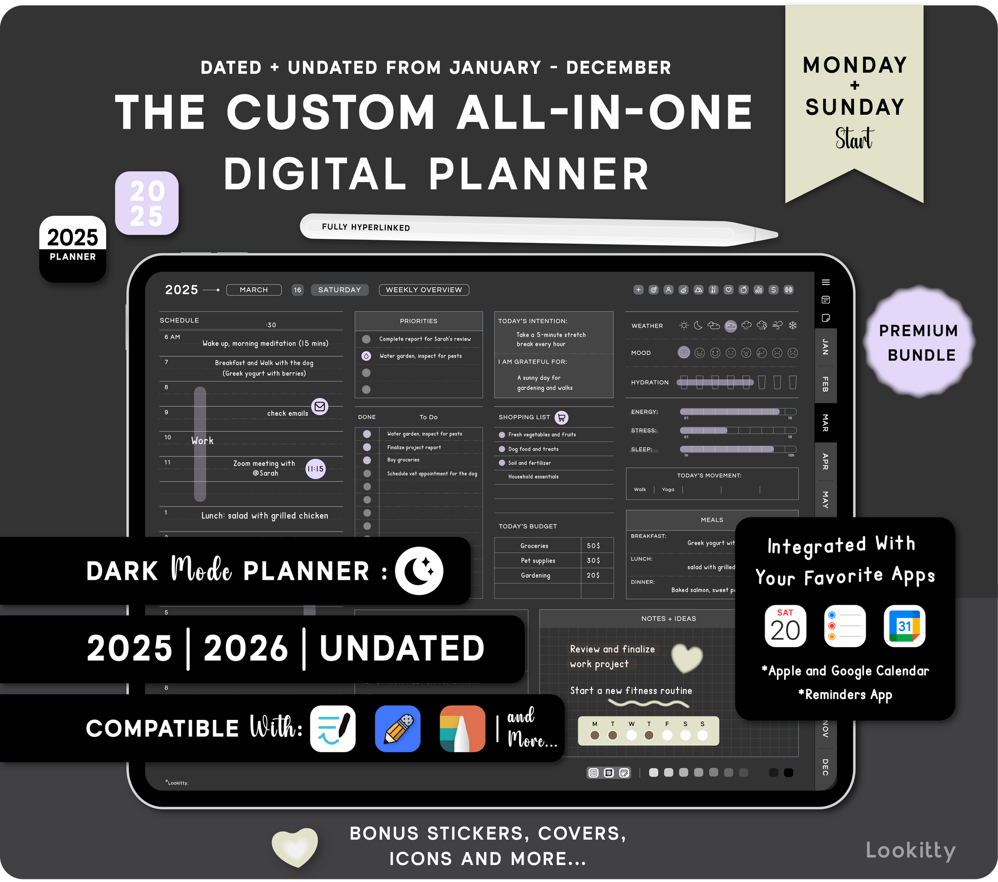 - Landscape Orientations: 2025 & 2026 Dark Digital Planner (January to December) and Undated Planner, offering unlimited future use and flexibility.